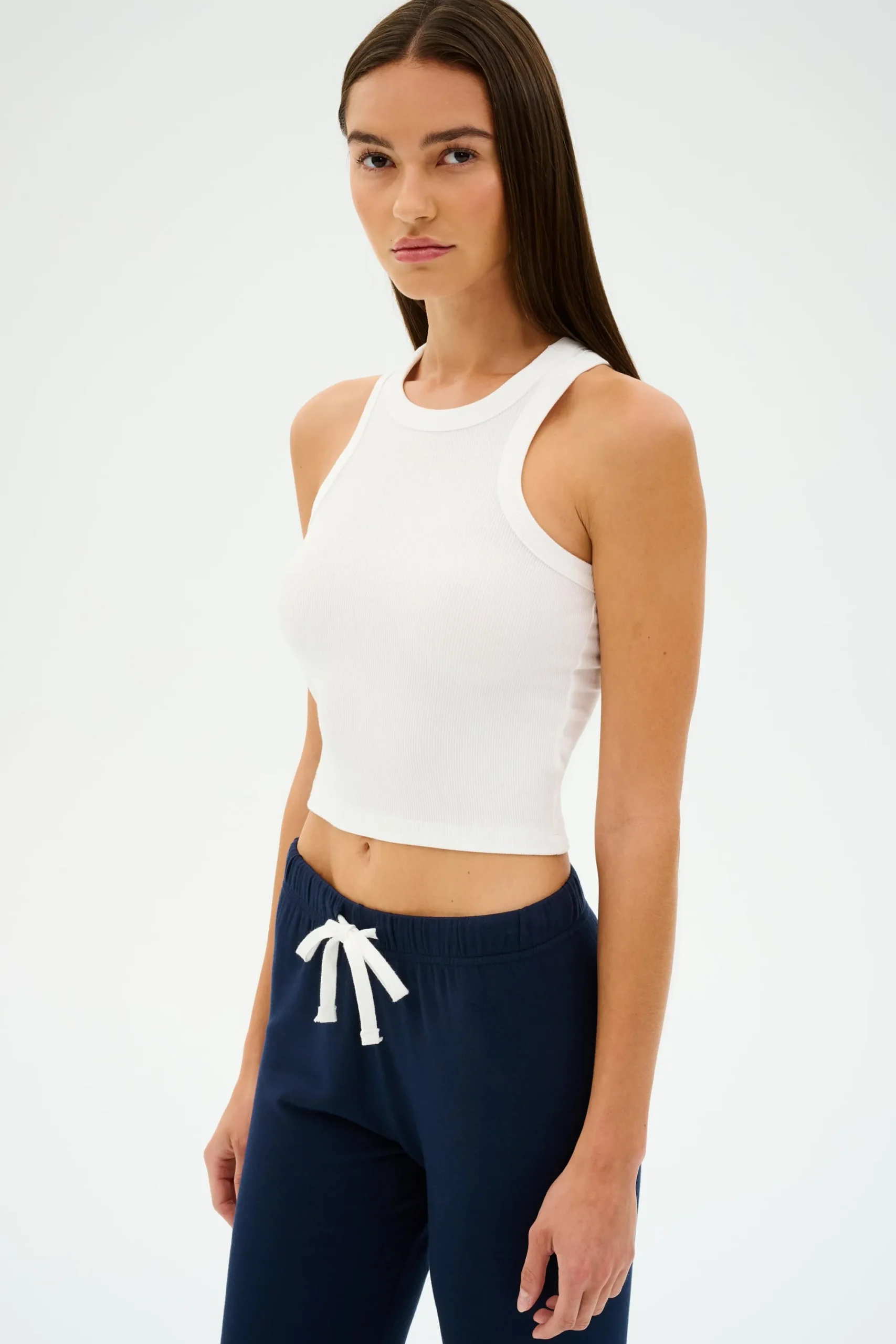 An effortlessly easy cropped tank with a high racer front and back neckline. Super soft baby rib fabric to hug your body and layer effortlessly.